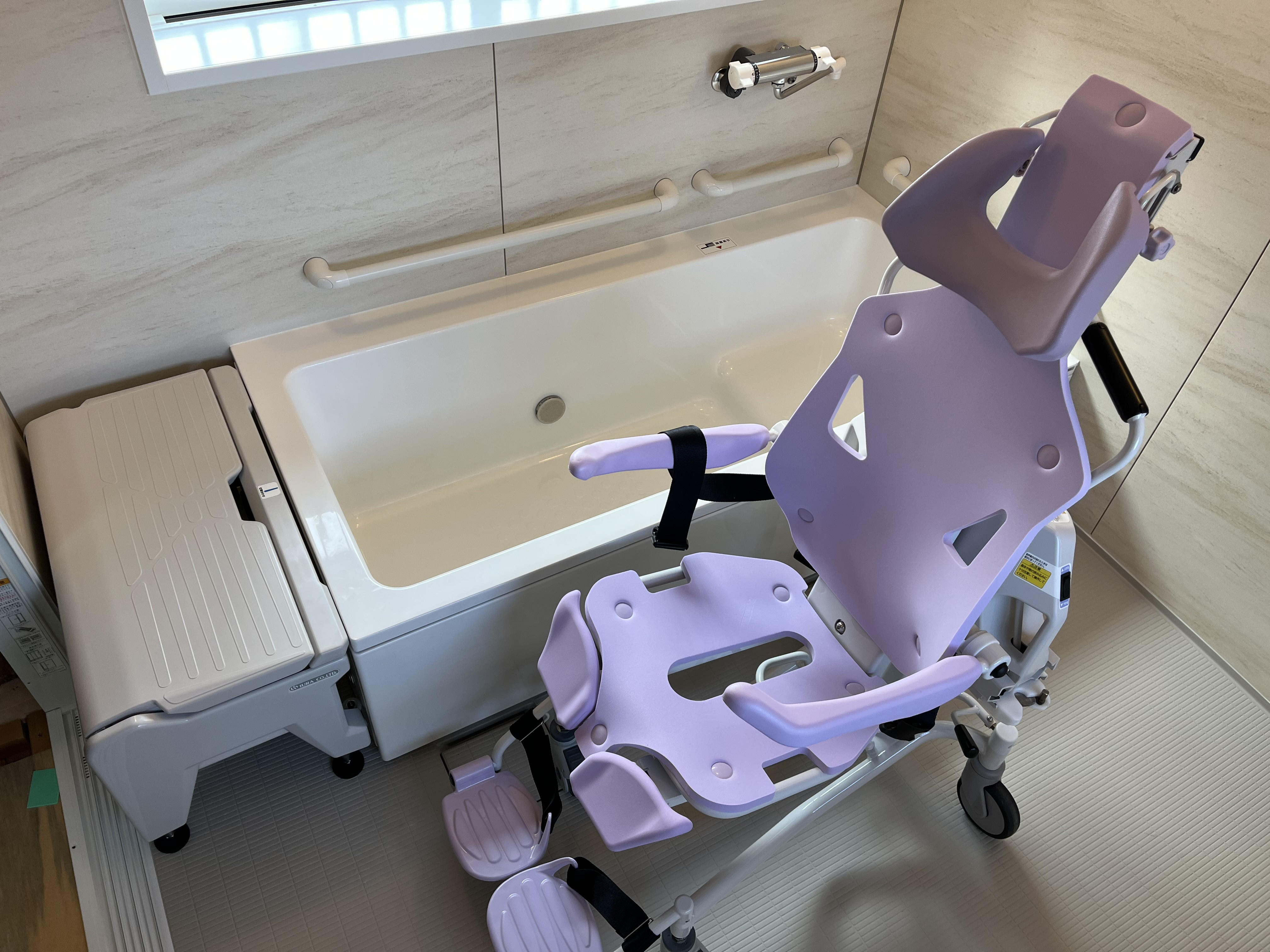 このたび、ご利用者さまの入浴時の事故防止と役職員の安全衛生環境改善(腰痛防止・事故防止・負担軽減)・生産性向上に向けて、いうら社製入浴介助用リフト付シャワーキャリーLS-310を導入しましたのでご案内します
